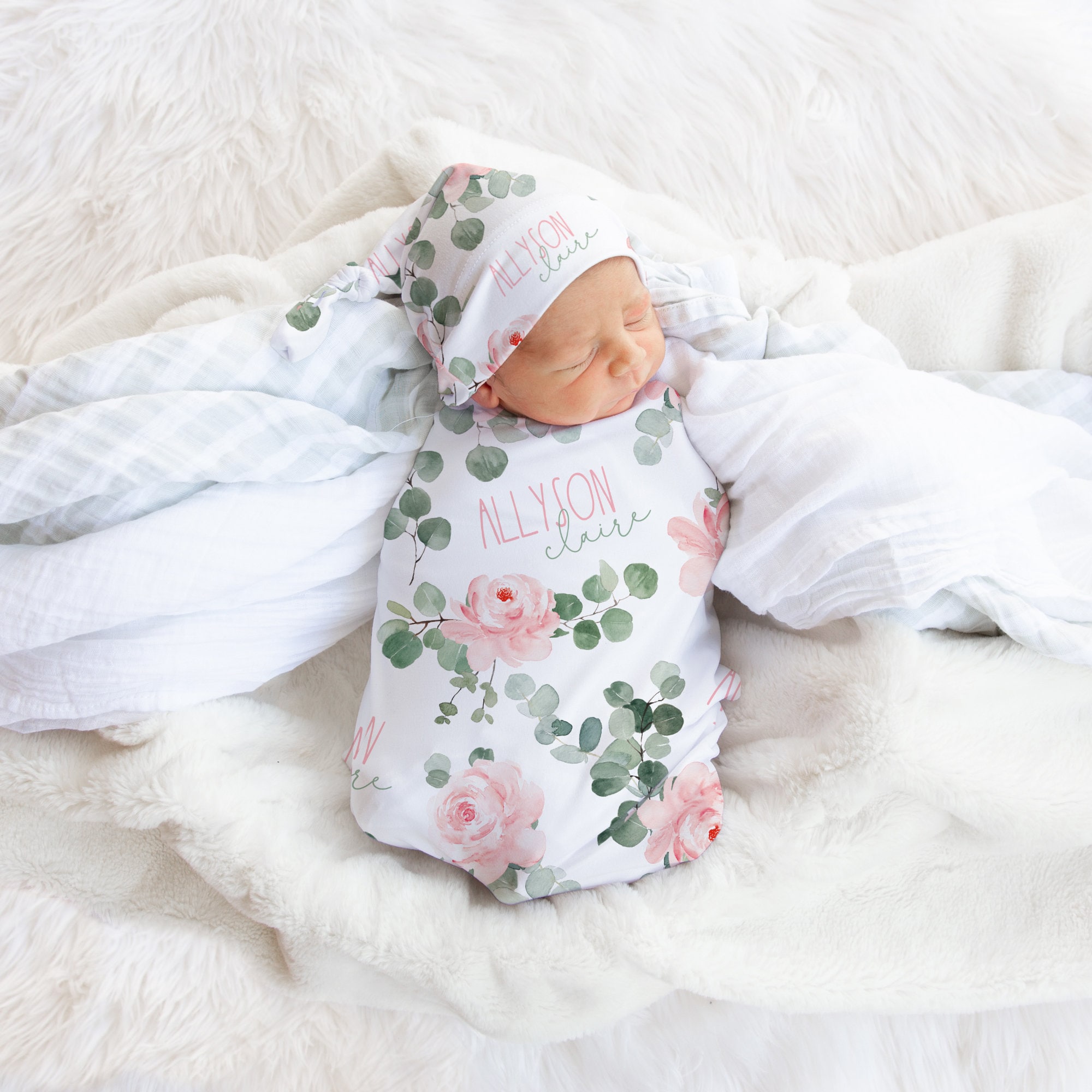 Personalized Baby Girl Swaddle, Hat, Headband, First & Middle Name, Custom Pink Floral Rose Eucalyptus, Two Fonts, Allyson Claire Collection
