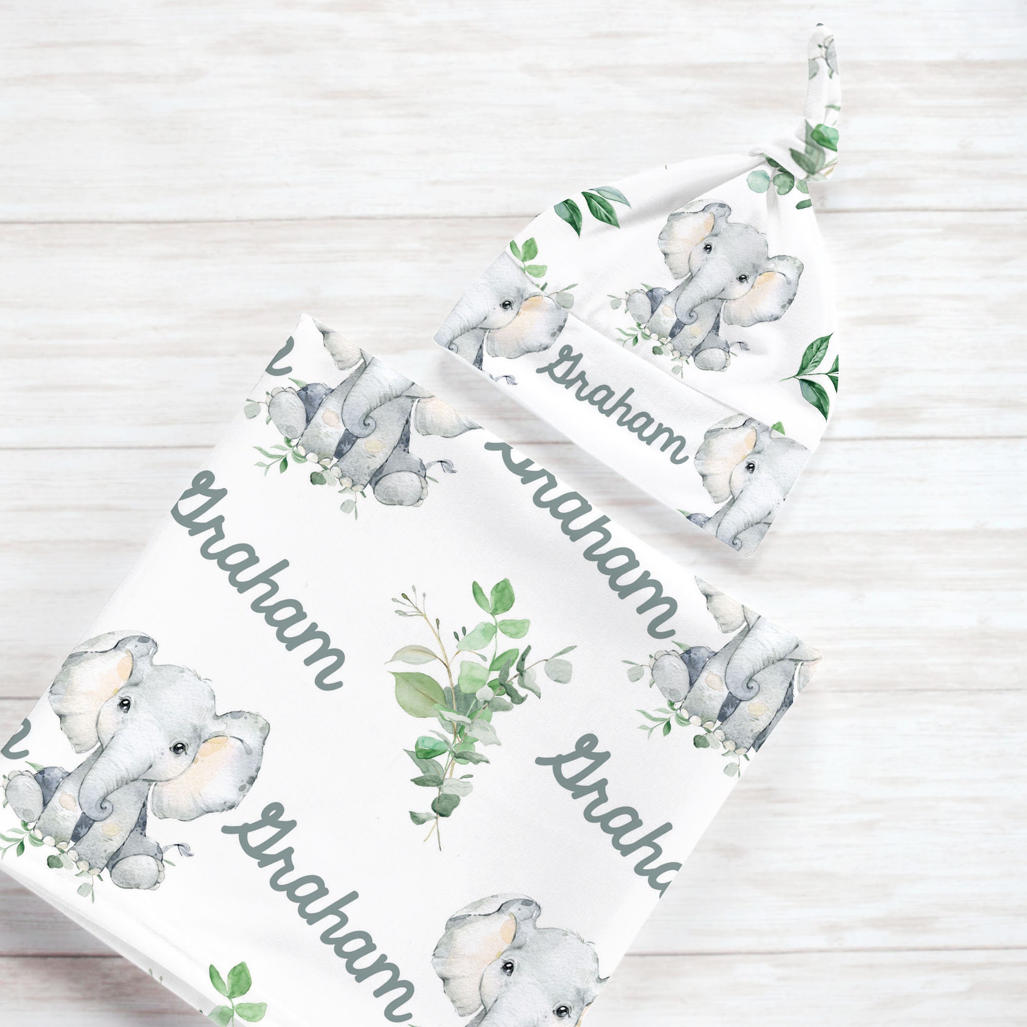 Elephant Baby Personalized Swaddle Blanket Set / Newborn Beanie Knotted Hat / Baby Shower Gift / Elephant / Graham Collection
