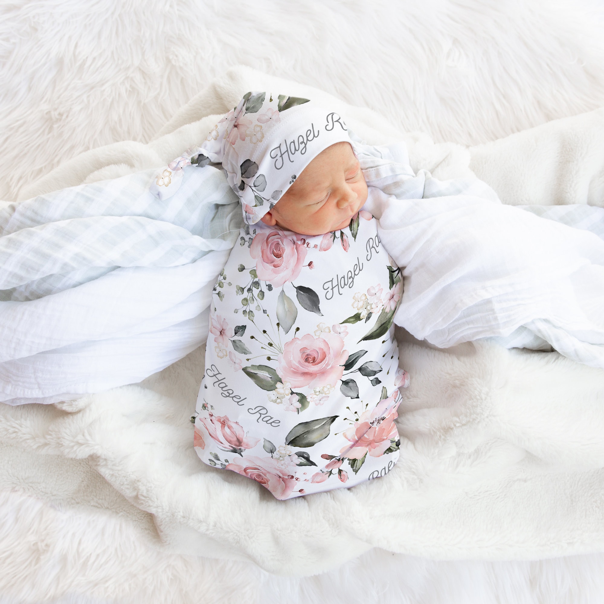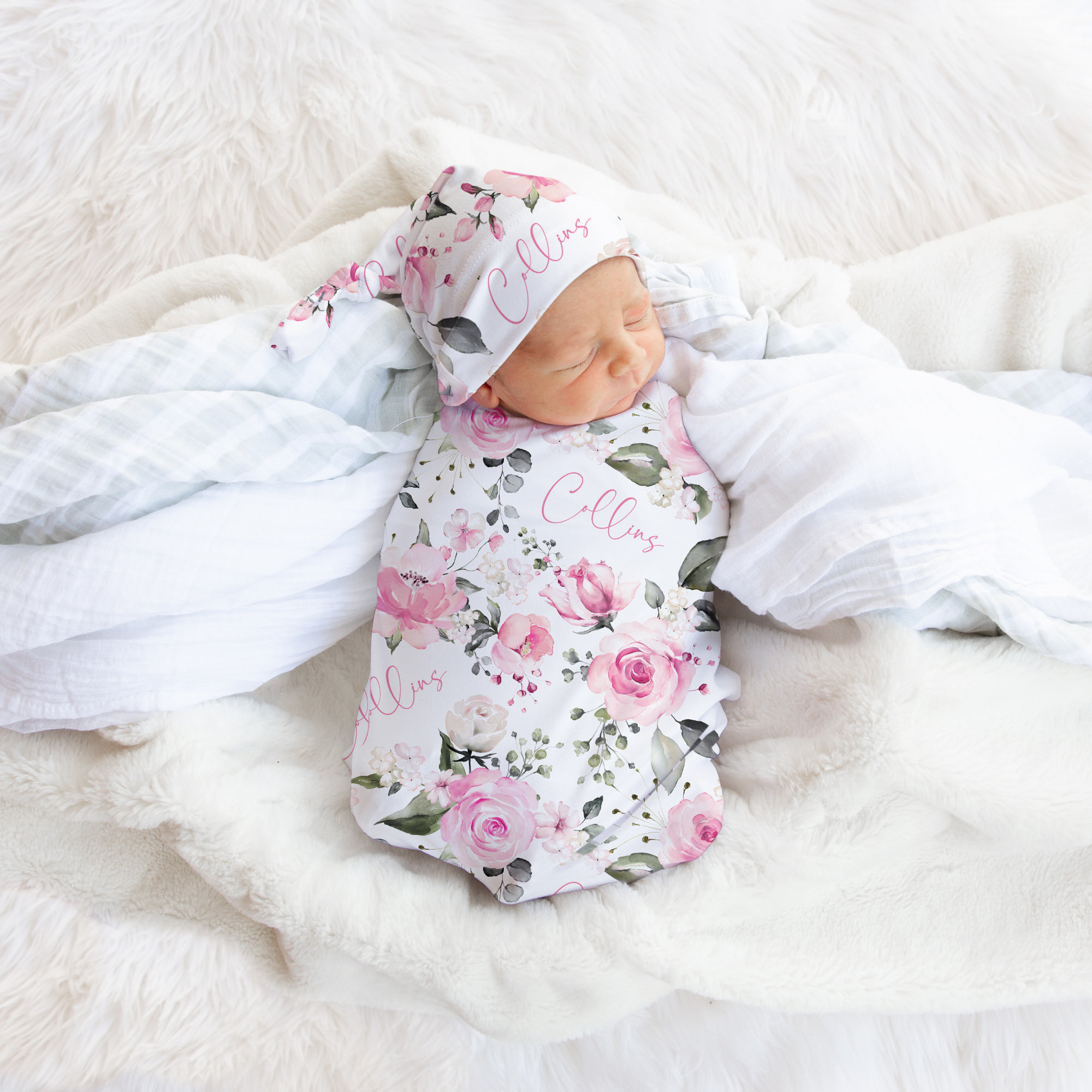 Floral Personalized Swaddle Blanket Headband Hat Set, Baby Girl Coming Home Outfit, Shower Gift New Mom, Hospital Photos Newborn Rose Pink